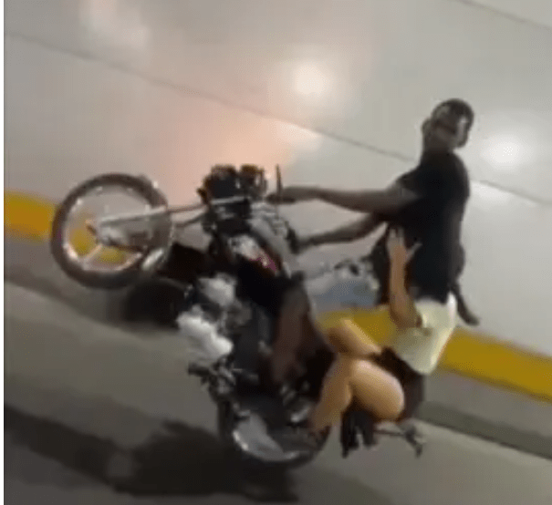 En las imágenes, el conductor levanta la rueda delantera de la motocicleta mientras circula a alta velocidad, acompañado de una joven que va como pasajera, sin ningún tipo de protección.