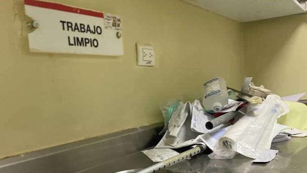 - Las gavetas y zona de «trabajo limpio» permanecían abiertas, y sobre las mesas se mezclaban jeringuillas, frascos de medicamentos, algodón, alcohol, mascarillas usadas, vasos plásticos y desechos, intensificado por el fuerte olor de pintura en plena atención médica.