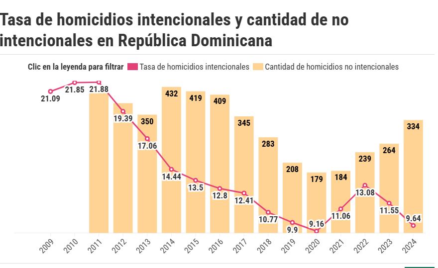 La disminución no debería atribuirse al Gobierno de turno porque esta tasa ha mostrado una tendencia descendente sostenida a lo largo del período 2009–2024, tal como consigna la Oficina Nacional de Estadísticas (ONE) en su «Anuario de muertes accidentales y violentas 2024».