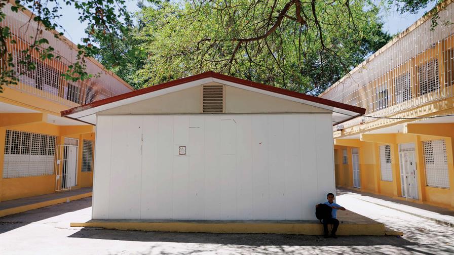 En el Centro Educativo Adelaida Acosta, en Hato Nuevo de Manoguayabo, hay habilitadas dos aulas móviles al lado de la cancha de la escuela, equipadas con mobiliario escolar: butacas, pizarrón, escritorio y sillas para el docente. Fueron levantadas en aproximadamente 15 días, según reporta el director del centro, Alfredo Lizardo.