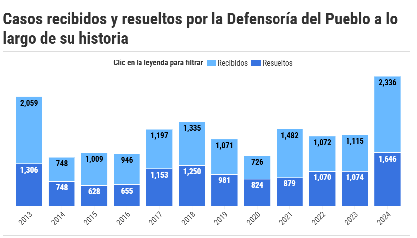 Entre 2013 y 2024, la institución recibió un total de 15,096 casos, de los cuales se han resuelto 12,214, lo que representa una tasa de resolución del 80.9 %. Estos datos se extrajeron de las memorias institucionales del Defensor del Pueblo, disponibles en su portal de Transparencia.