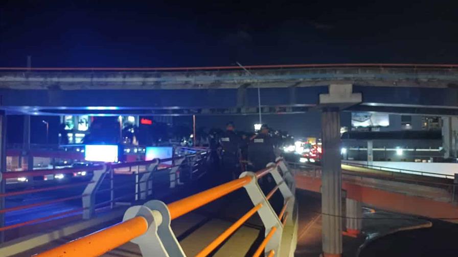 Una parte del puente está acordonado con medidas de seguridad, mientras otra se mantiene libre para el paso de los transeúntes que se dirigen a su destino, principalmente conectando con la línea 2 del Metro de Santo Domingo.