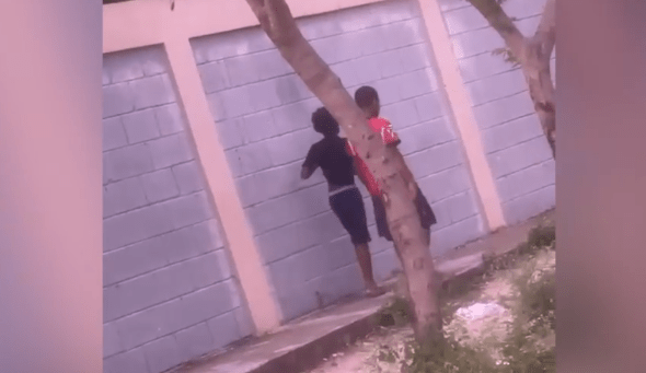 Posteriormente, uno de los niños, vestido con bermuda y polocher azul, portando el cuchillo dobla una esquina del centro educativo. Acto seguido, otro menor con un polocher rojo toma el arma blanca y regresa hacia la acera frente al plantel, donde persigue a otro estudiante, quien sale corriendo.